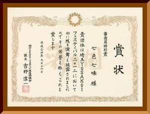 どんGALA!祭り / 新潟県柏崎市 7月20日(日) 3回目出場 「よさこいとやま賞」 ※2年ぶりに賞をいただくことができました。 これからのシーズンに弾みのつく受賞となりました。 |